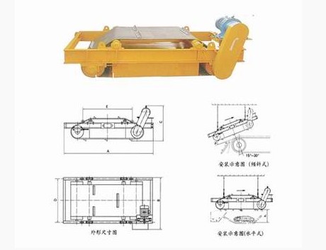被皮帶輸送機輸送的散狀物料,通過安裝在尾部支架上的磁選機(即旋轉的直流磁鐵)時,物料中的鐵磁雜物被吸,由棄鐵膠帶將鐵磁雜物拽至電動滾筒卸下,達到自動除鐵的目的。